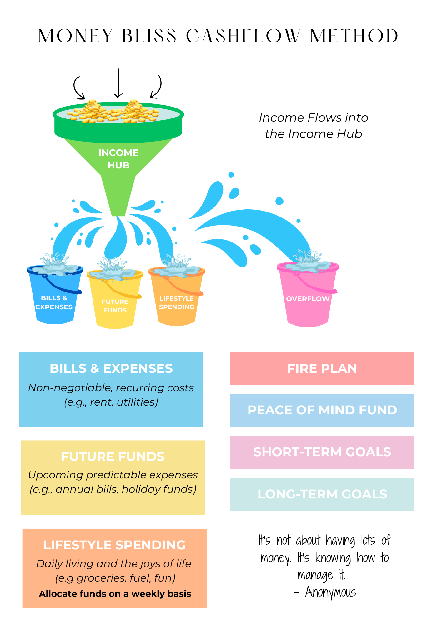The Money Bliss Cashflow Method Cheatsheet: Your quick-start guide to organising your finances in a balanced and stress-free way.