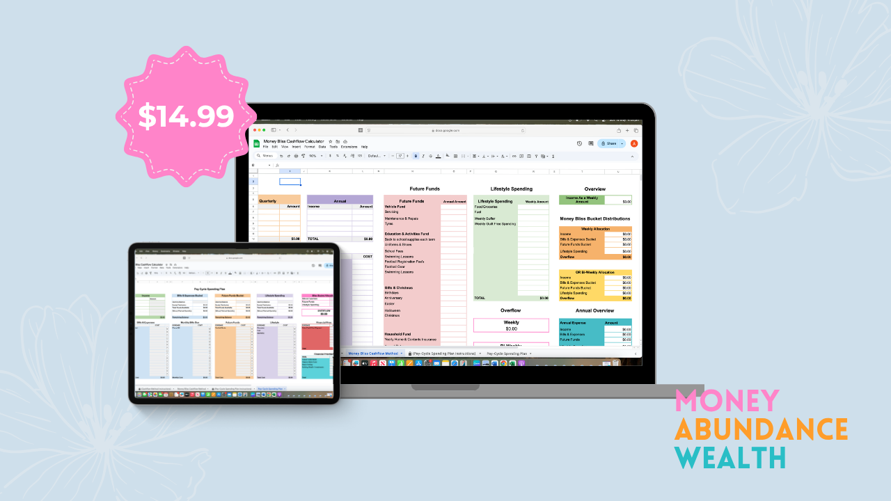 An easy-to-use spreadsheet that maps out your Bliss Buckets and pay-cycle plan helping you manage money with intention, flow, and confidence every time you get paid.
